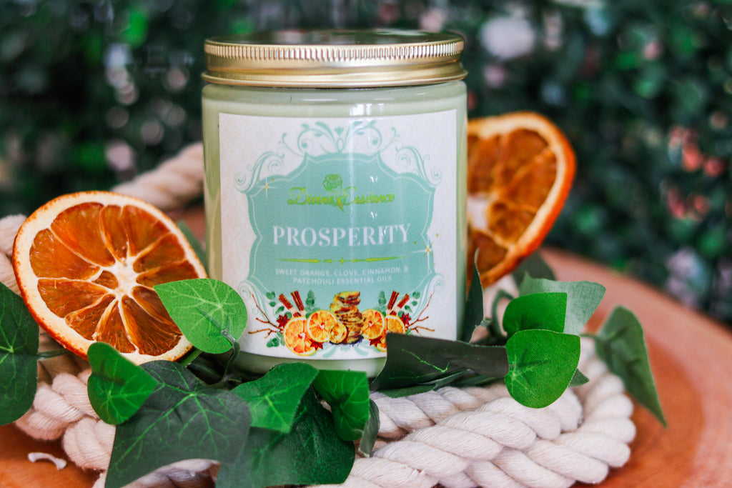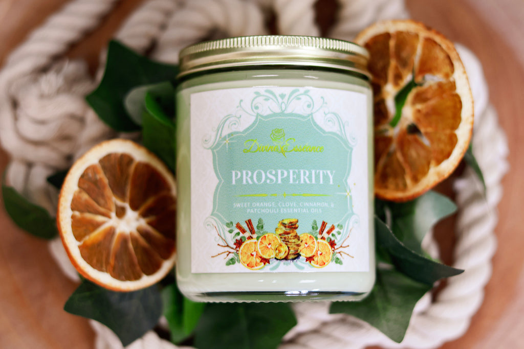 The Prosperity candle is scented with cinnamon, clove, orange, and patchouli essential oils. These scents throughout many cultures have been linked to good luck & gaining abundance in one's life. The invigorating unique blend of essential oils in the Prosperity candle will invite a joyous atmosphere and a high vibration of prosperity into your household or business.